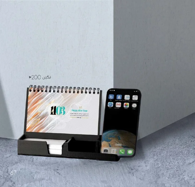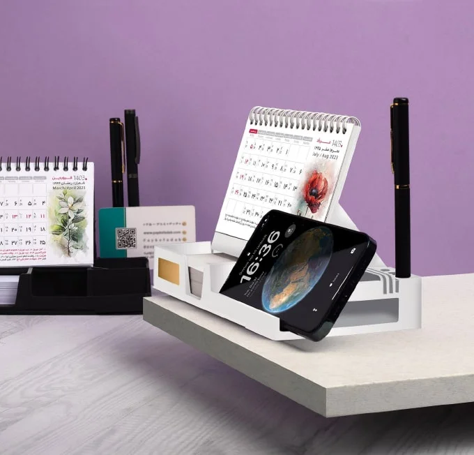 تقویم رومیزی پایه پلاستیکی همراه با برگه یادداشت نگین دارای نگهدارنده موبایل و خودکار و همچنین جای کارت ویزیت