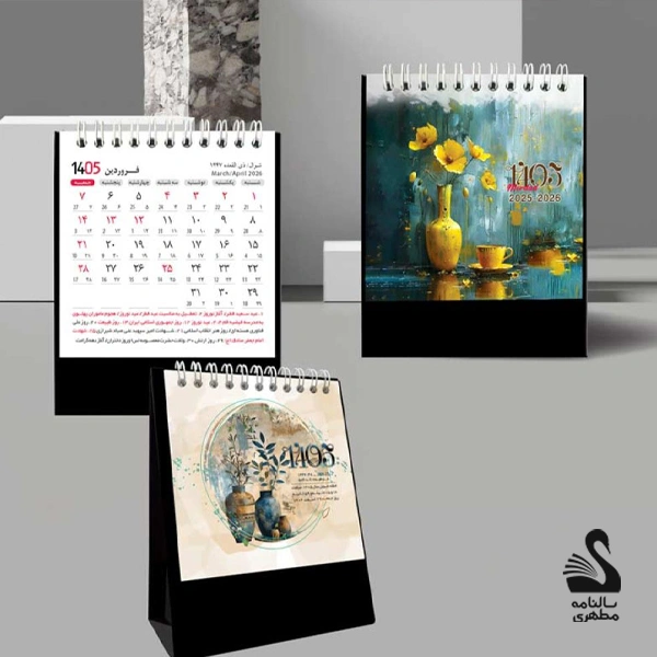 سالنامه مطهری انواع تقویم رومیزی کوچک ۱۴۰۵ را در سبکهای متنوع فانتزی، شیک، مینیمال و اداری عرضه میکند تا مطابق با سلیقه و نیاز هر فرد یا سازمان بهترین انتخاب را داشته باشید. ابعاد معمول این تقویمها ۱۰×۱۵ یا ۱۲×۱۸ سانتیمتر است و امکان چاپ اختصاصی لوگو، اطلاعات شرکت یا پیام برند روی پایه یا صفحات وجود دارد.